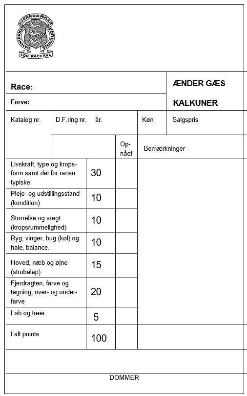 Pointskortet eller kåringskortet er det samme der benyttes ved bedømmelse af gæs, ænder eller kalkuner. Det har samme pointopdeling i de enkelte grupper som kortet til høns. Som det fremgår af det aftrykte pointskort, lægges der størst vægt på kortets øverste punkt: