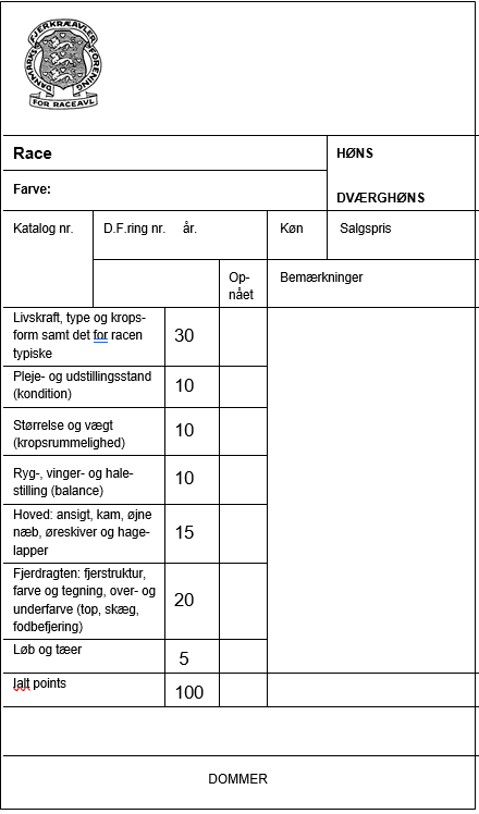 Gældende for høns, dværghøns, gæs, ænder, kalkuner og perlehøns. 3,3 bedømmes min. 1,1 med 2 × 94 p og 4 × 91 p.