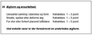 De ganske små fejl må selvsagt dømmes forholdsvis mildt, medens lidt større fejl stiller noget større krav til dommerens høje skøn for vedkommende races ideal.
