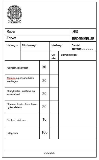 Den i Skandinavisk Fjerkræstandard angivne vægt for rugeæg er retningsgivende. Det højeste pointtal gives, når de udstillede æg passer til den angivne idealvægt, ikke gennemsnitsvægten, et stort æg kan således ikke opveje et mindre æg til en god gennemsnitsvægt.